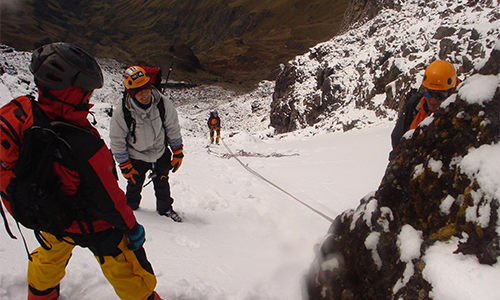 Para acceder al curso de hielo es obligatorio tener aprobado el curso de roca. Durante el curso de nieve se aprenden las diversas técnicas de progresión en glaciar así como lo básico sobre glaciares, tipos de nieve y maniobras de rescate y auto rescate.